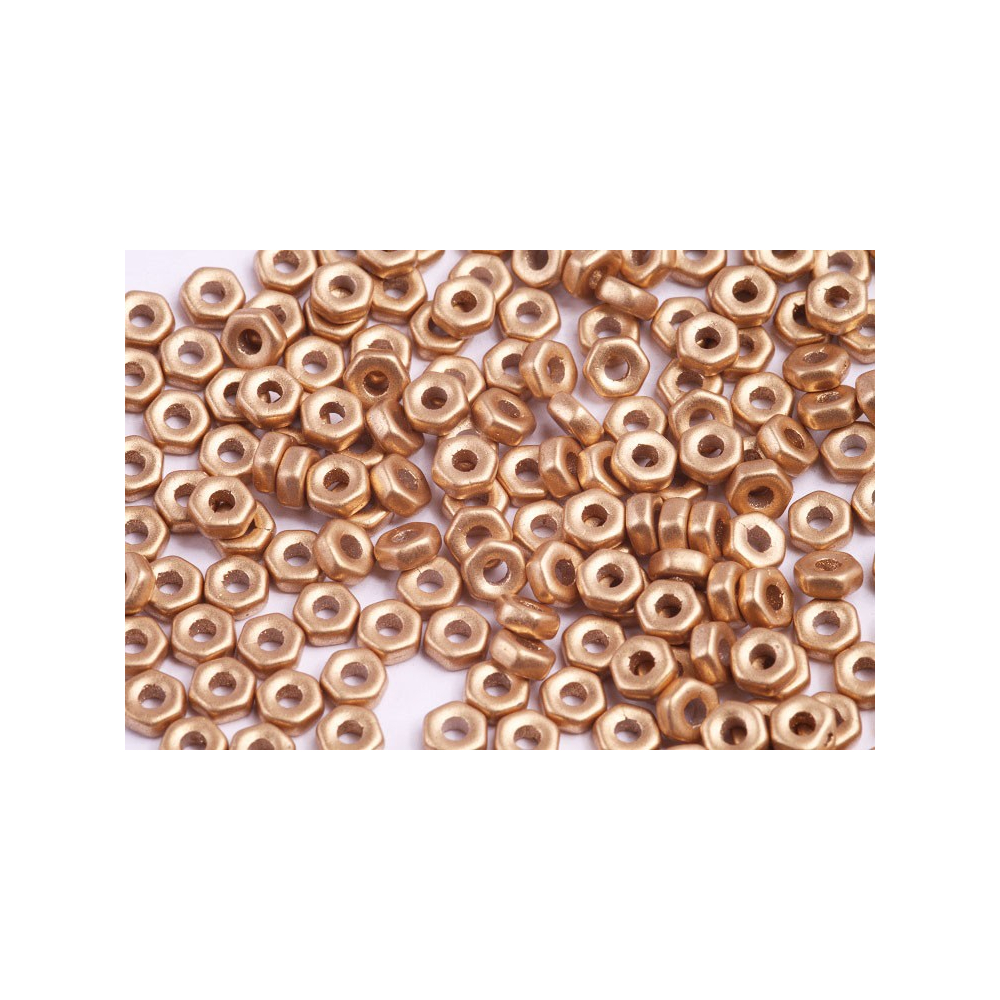 Zlatavý kovový odlesk často chybí v detailních vzorech, kde běžné tvary korálků působí příliš fádně. Hex Nut Beads 2 x 5 mm od rodinné firmy Rutkovský přinášejí do vaší tvorby technický, ale přesto elegantní prvek, který díky své zlaté barvě a matnému kovovému povrchu okamžitě zaujme. Tyto české skleněné korálky jsou vyráběny tradiční technologií ručního lisování, což zaručuje jejich precizní tvar a vysokou kvalitu pro náročné šperkařské projekty.