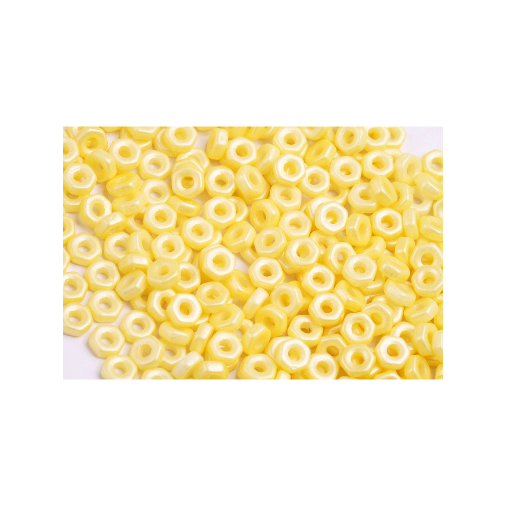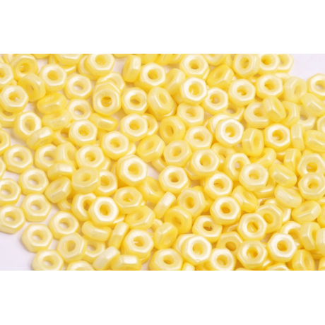 Jemně žlutý pastelový odstín s elegantním perleťovým finišem definuje tyto unikátní skleněné korálky z rodinné huti Rutkovský. Tradiční české sklářství se zde snoubí s moderním geometrickým designem tvaru Hex Nut Beads, který je v tuzemsku známý pod názvem Aureliox. Díky preciznímu ručnímu lisování získává každá matička o rozměru 2 x 5 mm dokonalé hrany, které v ploše vytvářejí fascinující struktury připomínající medovou plástev a dodávají šperku hloubku.
