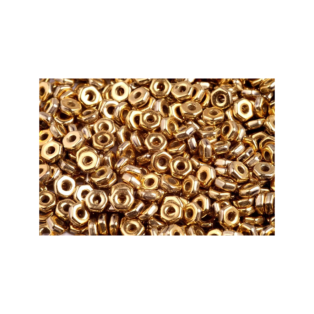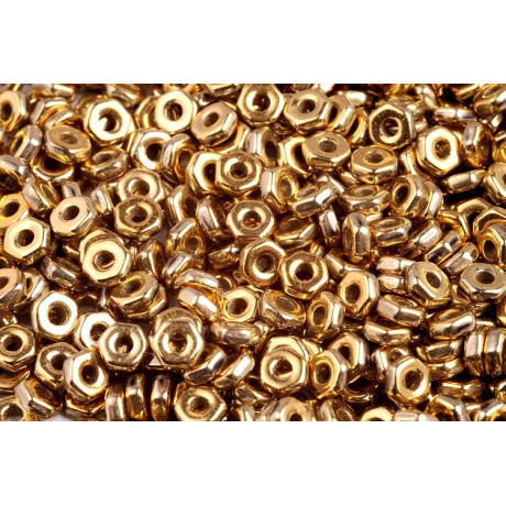 Geometrické linie ve tvaru šestihranných matiček umožňují vytvářet neotřelé struktury v kombinaci s klasickým rokajlem Preciosa velikosti 8/0 nebo 10/0. Zlatá barva s vysokým leskem skvěle doplní minimalistické náramky i složité náhrdelníky šité technikou peyote stehu nebo beadweaving. Díky svému specifickému tvaru se matičky skvěle řadí vedle sebe a vytvářejí tak fascinující metalické plochy, které v pohybu odrážejí světlo a dodávají šperku dynamiku.