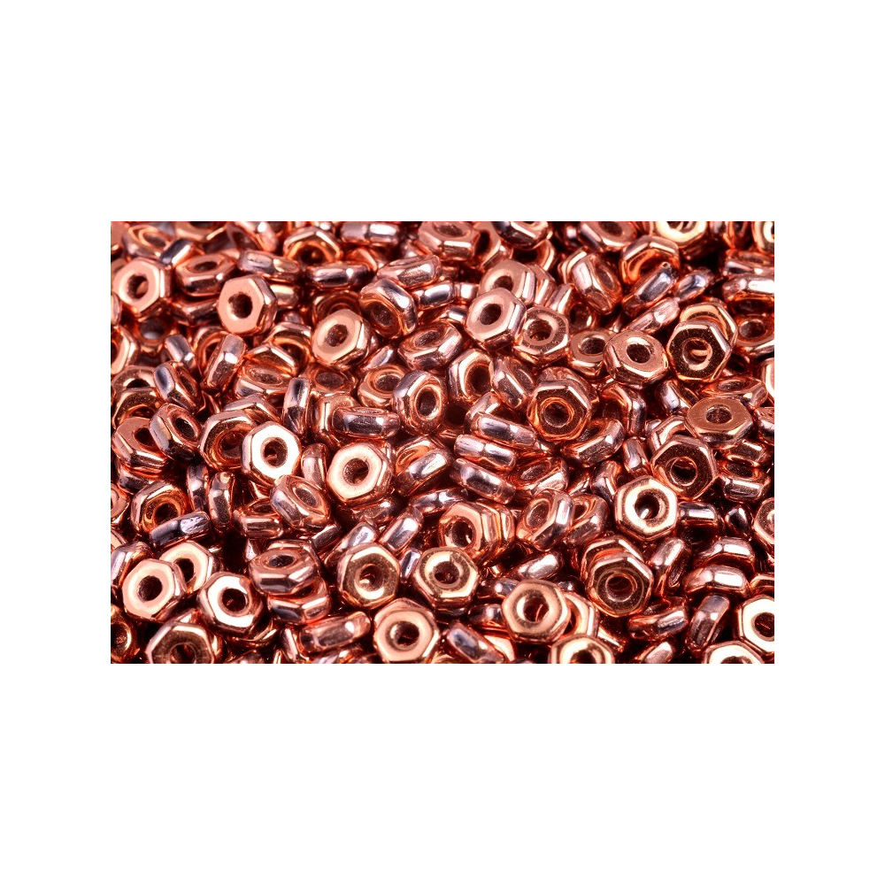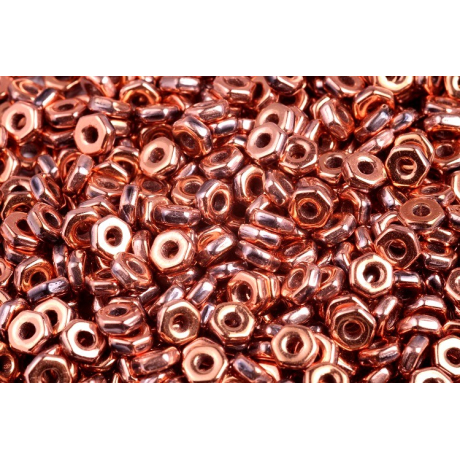 Měděné odlesky a geometrická preciznost definují tyto unikátní skleněné korálky, které vnášejí do bižuterní tvorby moderní industriální nádech. Tvar Hex Nut Beads 2 x 5 mm od rodinné firmy Rutkovský představuje spojení tradičního českého sklářství a inovativního designu, který je v současnosti velmi žádaný v minimalistických i bohatě zdobených špercích. Každý kus je výsledkem precizního lisování, které zajišťuje dokonalou uniformitu tvaru matičky, ideální pro přesné řazení v designu.