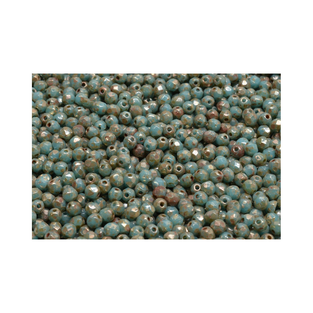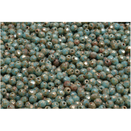 Tyrkysový základ s efektní patinou vytváří z těchto drobných fasetovaných kuliček naprostý unikát. Ohňovky / Broušené korálky o velikosti 3 mm od tradičního českého výrobce Rutkovsky představují vrchol sklářského umění, kde se snoubí precizní brus s uměleckou povrchovou úpravou. Skleněná hmota je v ohni leštěna, čímž získává svůj charakteristický lesk a jemně zaoblené hrany, které neřežou návlekový materiál.