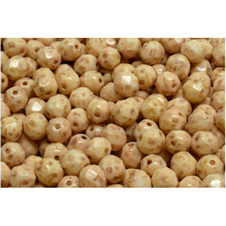 Béžová barva s hnědým mramorováním působí velmi organicky a je ideálním základem pro etno šperky nebo nadčasové doplňky v přírodním stylu. Broušené korálky s tímto dekorem krásně ladí s harmonickými tóny, jako je krémová či slonovinová, ale pro výraznější projekty je lze kombinovat s kontrastní safírově modrou nebo neutrálním akcentem v barvě červený siam. Často se využívají v náhrdelnících a náramcích, kde se střídají s prvky jako voskované perličky, čímž vzniká luxusní šperk s bohatou strukturou a tradičním českým nádechem.