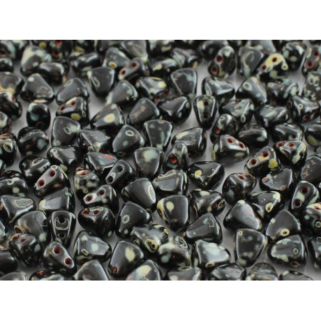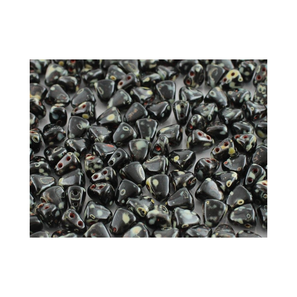 Černá barva s tmavými zemitými skvrnami vytváří sofistikovaný, starobylý vzhled, který vynikne zejména v kombinaci s kovovými odstíny. Pro dosažení vizuální hloubky a textury doporučujeme tyto korálky párovat s neutrálními stříbrnými akcenty nebo antracitovou šedou, zatímco čirý crystal dodá hotovému dílu potřebný jas. Díky specifickému tvaru klínu do sebe jednotlivé dílky perfektně zapadají, což oceníte při tvorbě kruhových motivů nebo prostorových objektů. Matubo SuperDuo a Nib-Bit se v komplexních dvoudírkových vzorech skvěle doplňují a umožňují plynulé přechody mezi různými geometrickými tvary.