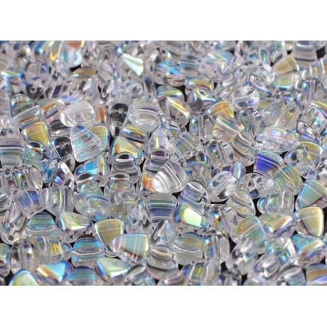 Průhledná čirá barva s efektem Aurora Borealis (AB) vytváří na povrchu fascinující hru barev, která sahá od jemně modré až po zlatavé tóny. Rozměr 6x5 mm a dvě dírky o průměru 0,8 mm umožňují vytvářet pevné a stabilní tvary, které u běžného rokajlu nejsou možné. Při tvorbě složitých prostorových objektů se často využívá drobný rokajl Preciosa jako spojovací výplň v Nib-Bit vzorech.