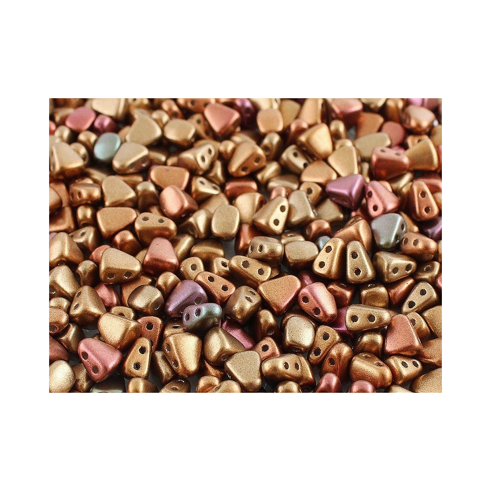 Matubo™ Nib-Bit v hřejivém odstínu CRYSTAL ORANGE RAINBOW představuje revoluci v geometrickém designu díky svému specifickému klínovitému tvaru. Tato bronzová varianta s metalickým odleskem a duhovým efektem skvěle doplňuje Matubo SuperDuo v komplexních dvoudírkových vzorech, kde vytváří plynulé přechody a zajímavé prostorové struktury. Korálky jsou lisovány ze špičkové skloviny Preciosa Ornela, což zaručuje jejich vysokou odolnost a barevnou stálost.