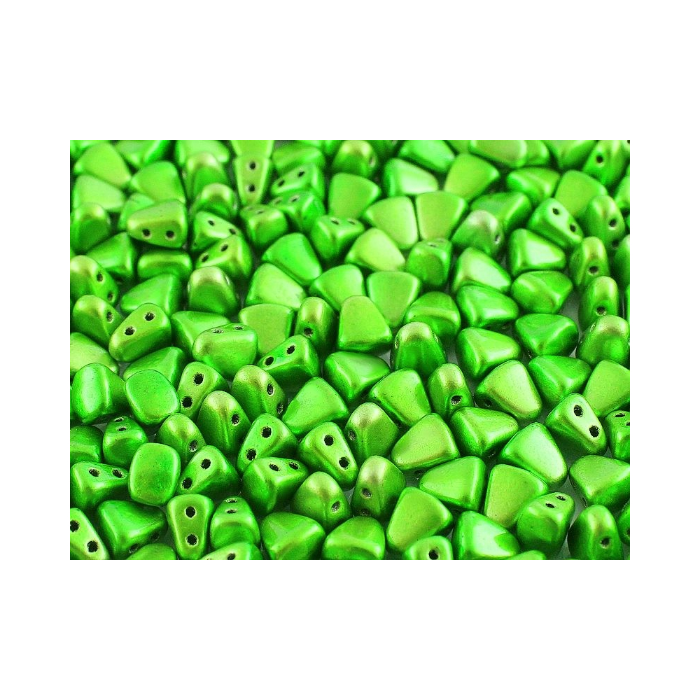 Matubo™ Nib-Bit představují moderní pojetí geometrie s rozměry 6x5 mm, které díky svému klínovitému tvaru dokonale zapadají do kruhových i prostorových motivů. Specifický design s dvěma otvory o průměru 0,8 mm otevírá prostor pro precizní beadweaving, kde je vyžadována maximální přesnost a souměrnost každého detailu. Sytá barva Metalust Apple Green s kovovým odleskem dodává výslednému dílu hloubku a moderní, svěží charakter.