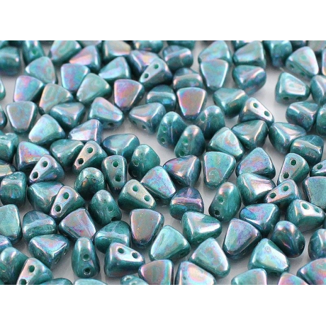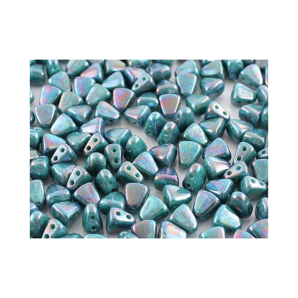 Tyrkysový odstín s fascinujícím povrchem TURQUOISE GREEN NEBULA dodává korálkům hloubku a tajemný odlesk, který připomíná barvy vzdálené galaxie. Tyto dvoudírkové korálky mají unikátní tvar klínku, který se směrem k jednomu konci zužuje, což umožňuje vytvářet dokonalé kruhové motivy nebo zajímavé prostorové textury. Jejich lesklý povrch s měňavými barevnými přechody vynikne zejména při dopadu přirozeného světla na hotový šperk.