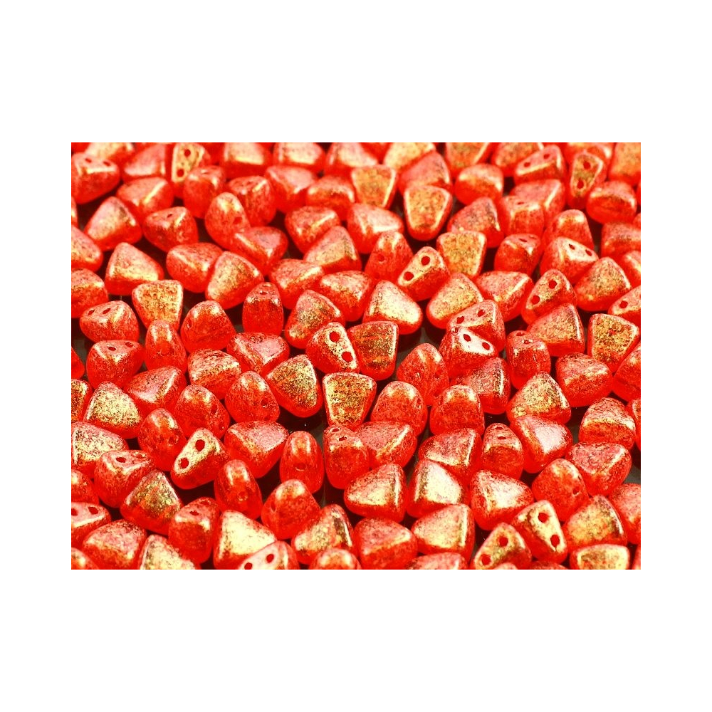 Sytě červená barva ruby v kombinaci s efektním zlatým popraškem odráží aktuální trendy v luxusní bižuterii, kde hrají prim texturované povrchy a hluboké odstíny. Tyto Matubo™ Nib-Bit korálky představují ideální volbu pro designéry, kteří hledají originální dvoudírkové korálky pro tvorbu prostorových šperků s vysokým leskem. Díky svému unikátnímu klínovitému tvaru o velikosti 6x5 mm umožňují vytvářet vějířovité tvary a kruhové mandaly, které jsou v současném beadweavingu velmi populární.