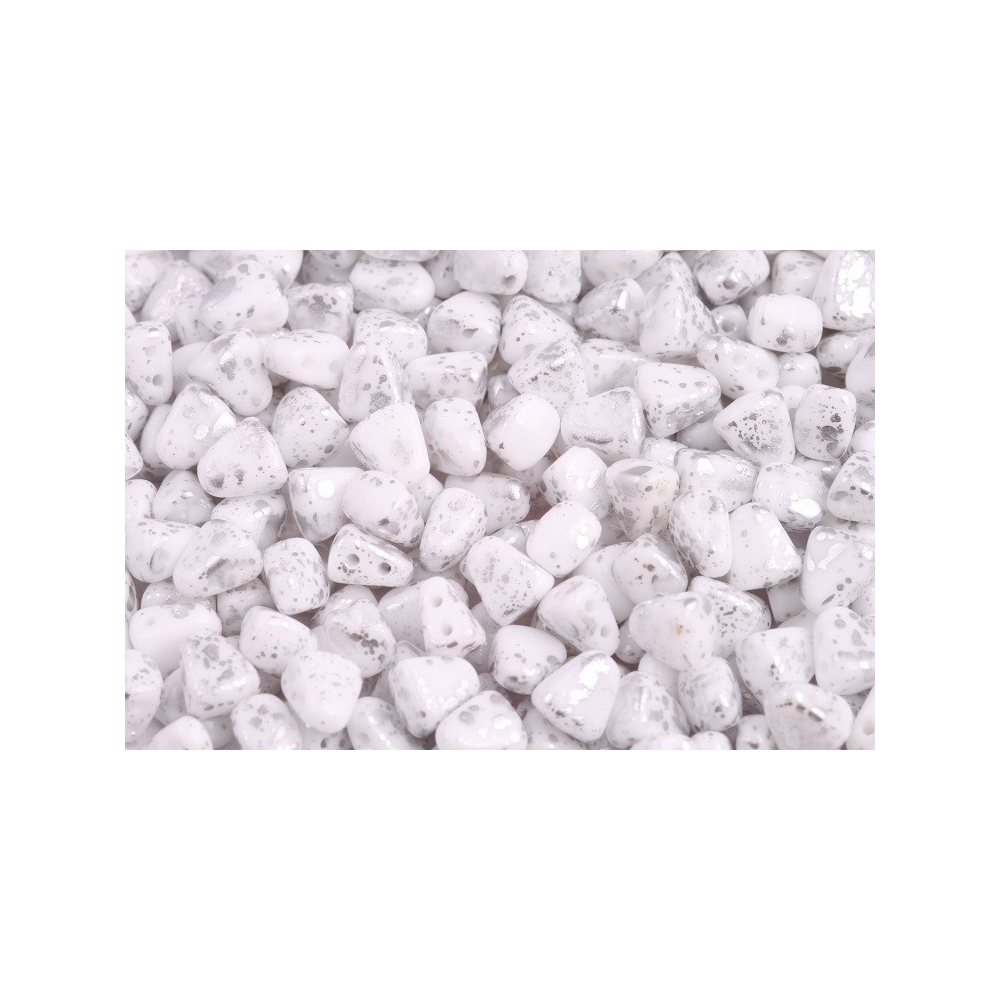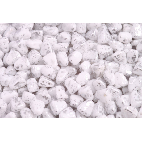 Bílá křídová báze s efektním stříbrným postřikem tvoří z Matubo™ Nib-Bit nepostradatelný prvek pro moderní beadweaving. Tento unikátní tvar se dvěma otvory umožňuje vytvářet složité geometrické vzory, které v kombinaci s kovovými odlesky působí velmi luxusně. Při práci s těmito dvoudírkovými korálky z českého skla oceníte především jejich přesný tvar a hladké hrany, které chrání váš návlekový materiál.