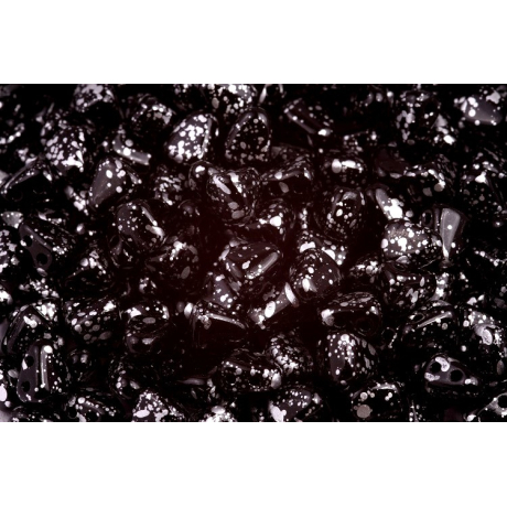 Materiál z českého skla vyniká odolností, ale pro maximální životnost stříbrného efektu doporučujeme šperky chránit před přímým kontaktem s parfémy. Pro dosažení dramatického vizuálního kontrastu zkombunujte tento stříbrno-černý design s korálky v barvě červený siam, což vytvoří nepřehlédnutelný prvek v každém designu. Klínovitý tvar Nib-Bitu umožňuje jeho použití nejen jako hlavního prvku, ale i jako ozdobného lemu u obšívaných kabošonů či rivoli. Celkový dojem z hotového díla pak umocní neutrální akcent v podobě korálků černý jet, které podpoří hloubku stříbrného splash efektu.
