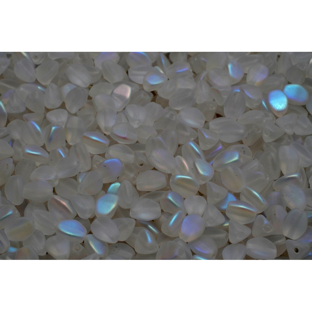 Krystalový základ s jemnou matnou texturou a duhovým odleskem definuje tyto ručně mačkané skleněné korálky z rodinné hutě Rutkovský, Česká republika. Rozměr 5 x 5 mm s precizně vycentrovaným průtahem 0,8 mm zaručuje bezproblémové navlékání i při vícenásobném průchodu nití, což je klíčové pro složité Pinch beads vzory. Tato tradiční česká pohanka vyniká svou tvarovou stálostí a specifickým trojbokým tvarem, který dodává šperkům unikátní 3D strukturu a hloubku.