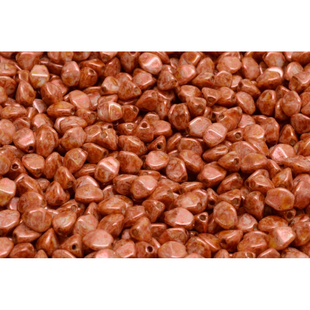 Broskvová barva s jemným mramorováním a perleťovým odleskem definuje tyto ručně mačkané skleněné korálky od rodinné firmy Rutkovský, Česká republika. Výroba každého kusu navazuje na staletou tradici severočeského sklářství, kde se precizně vybraná sklovina tvaruje do unikátních forem s důrazem na detail. Tvar Pinch Beads, u nás známý jako pohanka, nabízí díky svým třem stranám zajímavý lom světla a texturu, která vynikne zejména v kombinaci s dalšími prvky, jako jsou české broušené ohňovky v náhrdelníkových vzorech.