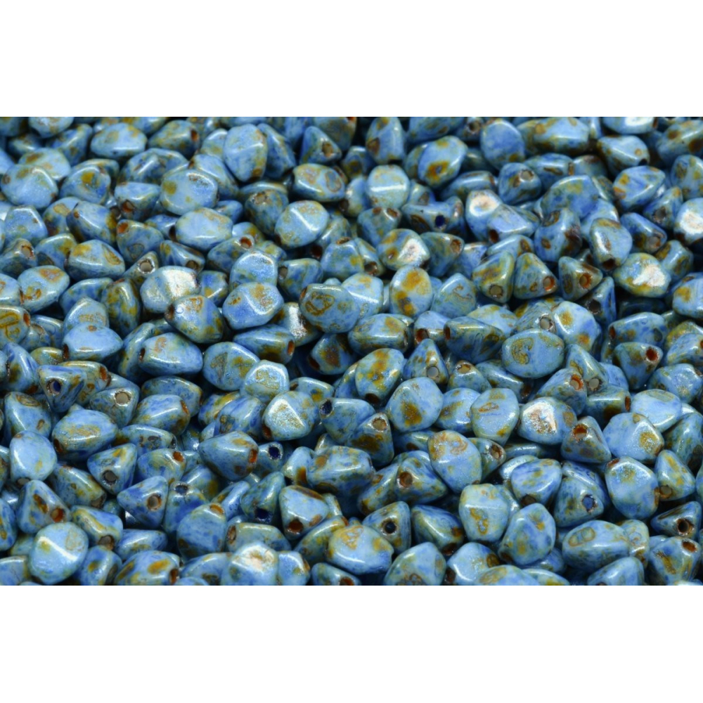 Modrý tóny s jemným kropením v odstínu OPAQUE BLUE/GREEN SPOTTED dodávají těmto Pinch beads nezaměnitelný přírodní charakter. Jsou výsledkem tradičního českého sklářství rodinné firmy Rutkovský, Česká republika, kde se každý kus rodí pod rukama zkušených mistrů lisování. Díky svému specifickému trojbokému tvaru, kterému se u nás říká pohanka, skvěle zapadají do složitých prostorových vzorů a krásně doplňují oblíbené korálky Matubo™ SuperDuo v náročnějších projektech.