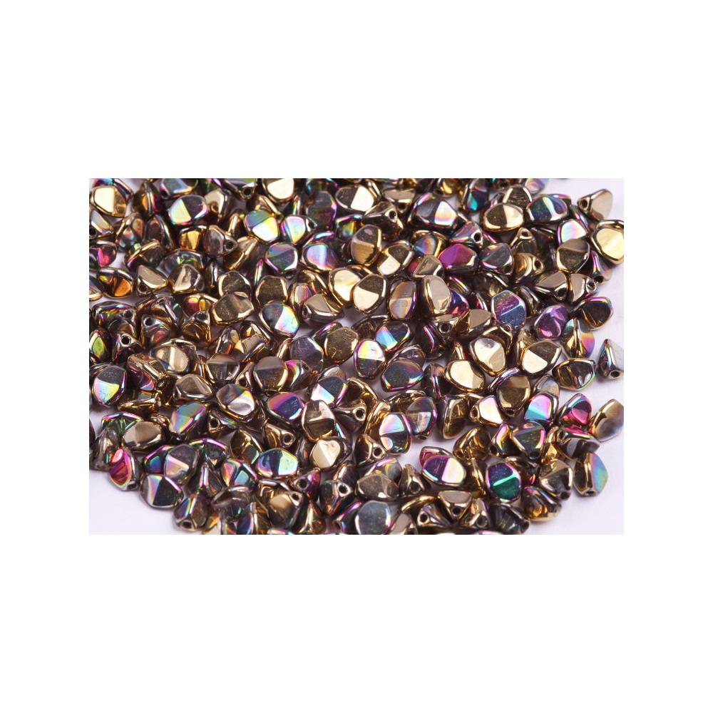 Zlatavé odlesky s duhovými přechody v odstínu California Meadows definují tyto unikátní skleněné korálky typu Pinch Beads, známé také pod českým názvem Pohanka. Tento specifický trojboký tvar o rozměru 5 x 5 mm pochází z dílny rodinné firmy Rutkovský, která v sobě snoubí tradiční české sklářství a precizní ruční výrobu každého kusu. Jejich fazetovaný povrch odráží světlo v bohaté paletě tónů, které dodají hloubku jakémukoliv designu.