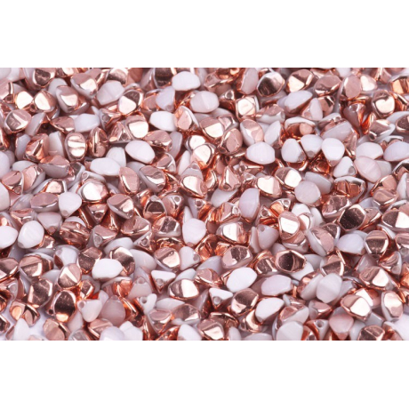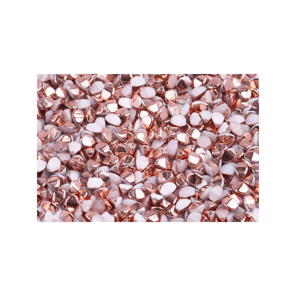 Trojboký tvar, pro který se v Česku vžil název Pohanka, dodává šperkům zajímavou texturu a hloubku, které s běžným kulatým korálkem nikdy nedosáhnete. Skvěle se hodí pro prostorové šití, kde se dají efektivně kombinovat s materiály jako je rokajl Preciosa ve velikostech 8/0 nebo 10/0, jenž poslouží jako ideální výplň v mezerách mezi jednotlivými ploškami. Tato barevná varianta White Alabaster Gold Capri vyniká svým polovičním pokovem, který na bílém podkladu vytváří hřejivé zlatavé odlesky připomínající luxusní bižuterii.