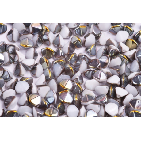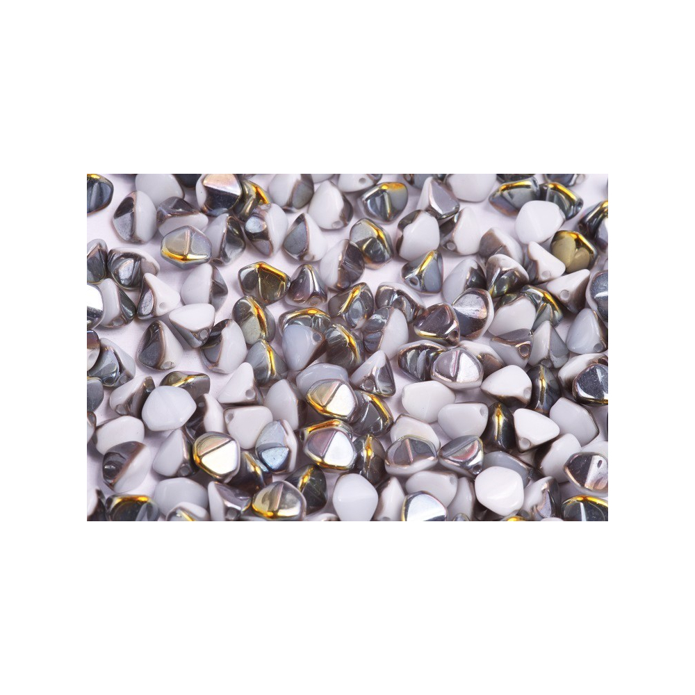 Bílá alabastrová základna s fascinujícím pokovem Marea definuje tyto Pinch beads od rodinné firmy Rutkovský, Česká republika. Tyto ručně lisované skleněné korálky vynikají svým trojbokým tvarem, který dodá vašim projektům hloubku a texturu. Jsou ideální pro vytváření bohatých struktur, kde se skvěle doplňují s komponenty jako české broušené ohňovky, čímž vznikají luxusní náhrdelníkové vzory s vysokým leskem.