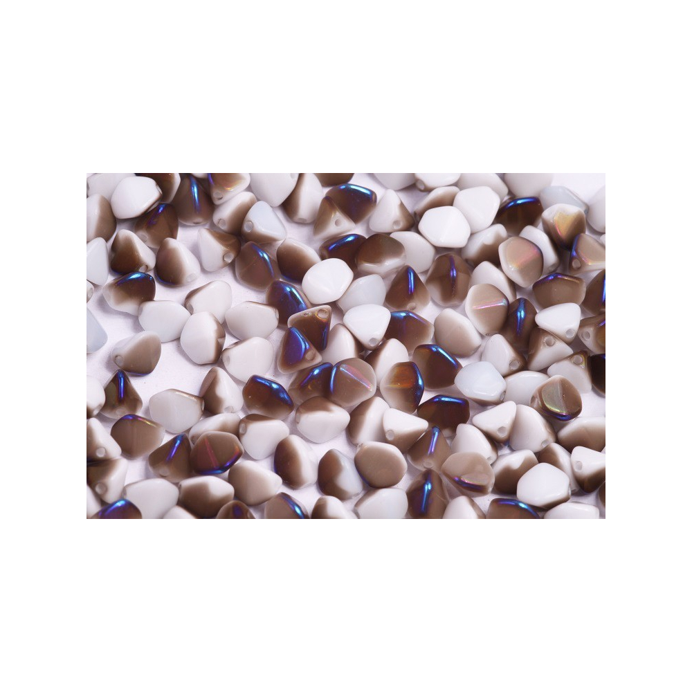Ručně lisované korálky vynikají specifickým trojbokým tvarem, který do vašich kreativních projektů vnese hloubku a zajímavou geometrii. Povrchová úprava Sliperit vytváří na mléčném podkladu kovové odlesky přecházející od hnědé až po modrofialovou barvu. Tato vizuální kombinace je ideální pro obšívání kabošonů nebo tvorbu bohatých náhrdelníků s nádechem starožitného luxusu.