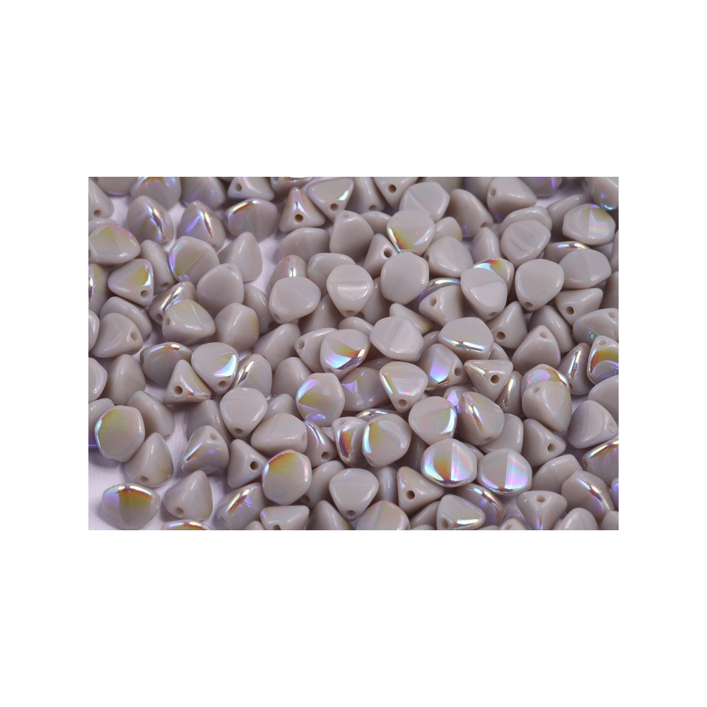 Šedý popelavý odstín s jemným duhovým odleskem definuje tyto ručně lisované skleněné korálky z tradiční rodinné dílny Rutkovský. Jejich specifický trojboký tvar, známý jako Pinch Beads nebo česky pohanka, vyniká v prostorových šitých projektech, kde se dají skvěle kombinovat s Matubo™ SuperDuo pro vytvoření pevných a geometricky zajímavých struktur. Tradiční české sklářství se zde snoubí s moderním povrchem AB, který na 7 mm velkých ploškách hází decentní barevné odlesky při každém pohybu.