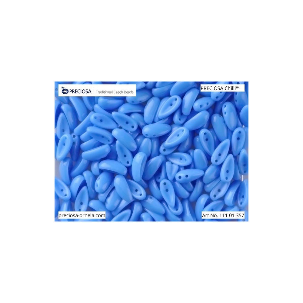 Modrá barva sytého neprůhledného skla dodává těmto dvoudírkovým korálkům Preciosa Chilli o rozměru 4 x 11 mm hloubku a eleganci. Jsou vyrobeny z tradičního českého skla a jejich unikátní prohnutý tvar umožňuje designérům vytvářet organické struktury, které připomínají lístky nebo šupiny. Tento tvar se těší velké oblibě i ve světové autorské tvorbě a skvěle doplňuje prvky jako Preciosa Pip nebo vybrané tvary z francouzské kolekce Amos® par Puca®, se kterými vytváří harmonické geometrické celky.