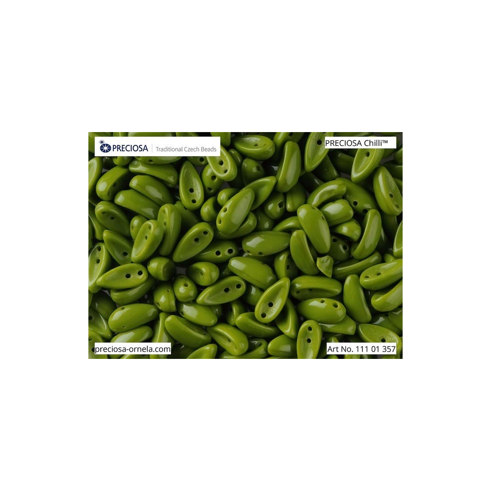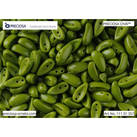 Dvoudírkové korálky Preciosa Chilli v sytém barevném provedení Olivine Opaque nabízejí díky svému unikátnímu tvaru prohnutého lusku o rozměru 4 x 11 mm nekonečné možnosti pro prostorovou tvorbu a pokročilé techniky šitého šperku. Jejich ergonomický tvar dovoluje vytvářet plynulé křivky a plastické reliéfy, které u běžných tvarů nejsou možné.