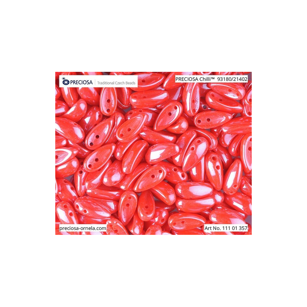 Tvarované korálky Chilli vyžadují pevnou nit, proto je pro nejlepší výsledky a stabilitu šperku ideální nit S-lon FIRE, kterou doporučujeme navlékat se specializovanou korálkovací jehlou velikosti 10-11. Pro dosažení harmonického vzhledu ladí tato barva krásně s vínovou či burgundy, zatímco pro výrazný kontrast je můžete zkombinovat se smaragdově zelenou nebo černým jetem. Při navrhování se nebojte experimentovat s prostorovým vrstvením, kde vynikne jejich unikátní křivka.