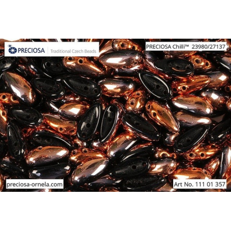 Mačkané dvoudírkové korálky Preciosa Chilli 4 x 11 mm Black Opaque, Sunset, Half 23980/27137