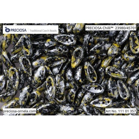 Skleněné mačkané korálky o rozměru 4 x 11 mm vynikají svou specifickou povrchovou úpravou, kde se mísí neprůhledná černá s jasnými žlutými skvrnami. Pro dosažení profesionálního vzhledu a zaplnění drobných mezer v designu je ideální využít drobný rokajl Preciosa, který barevně sjednotí celou kompozici a dodá šperku potřebnou stabilitu.