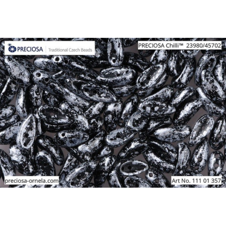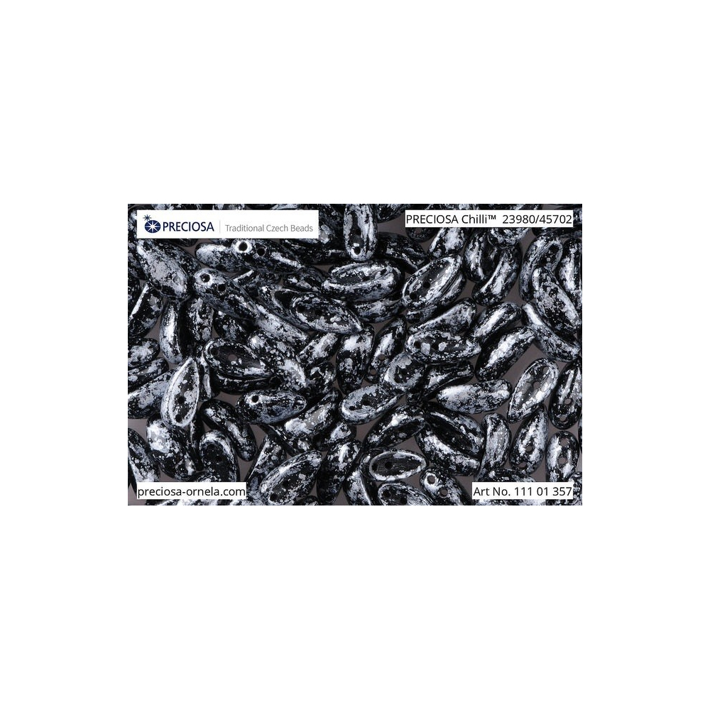 Černé neprůhledné sklo s označením Black Opaque tvoří základ, na který je nanesena efektní povrchová úprava Granite Silver. Tato kombinace dodává korálkům industriální a moderní vzhled, který vynikne v pánských i elegantních dámských špercích. Jako spojovací a výplňový materiál se k nim ideálně hodí drobný rokajl Preciosa v odpovídajících metalických tónech.