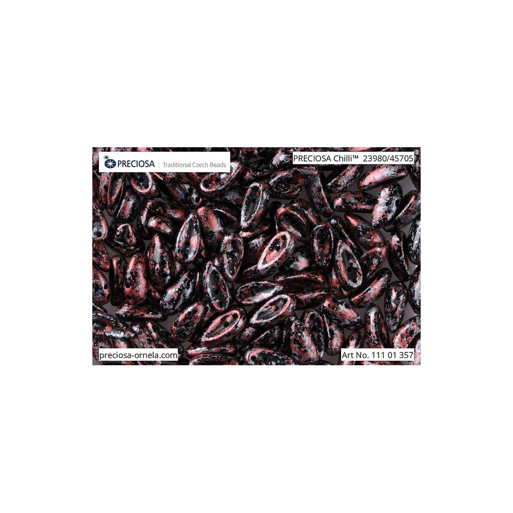 Černý základ s dramatickým červeným žíháním přímo vybízí k odvážným experimentům, kdy jako středové korálky v rozetách skvěle poslouží české broušené ohňovky. V květinových a hvězdicových motivech se pak tvar Chilli báječně doplňuje s korálky Matubo SuperDuo, čímž vznikají fascinující plastické kompozice. Krásně ladí s doplňky v barvě hematitová, které podtrhnou hloubku dekoru č. 30. Tyto mačkané korálky najdou své uplatnění především v pokročilých technikách šití korálků, kde se jejich prohnutý profil postará o dynamiku a originální texturu každého autorského šperku.