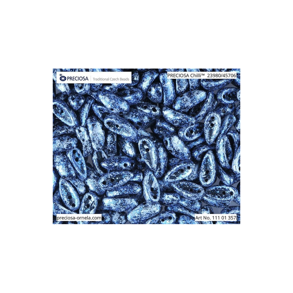 Granite Blue v kombinaci s unikátním tvarem okvětního lístku přináší do světa bižuterie nový rozměr organického designu. Tyto mačkané korálky Chilli od tradičního českého výrobce Preciosa vynikají specifickým žíhaným povrchem, který připomíná přírodní kámen a dodává každému šperku hloubku a texturu. Jejich prohnutý tvar je ideální pro vytváření bohatých prostorových kompozic, které kopírují aktuální trendy směřující k přírodním motivům a neotřelým strukturám.