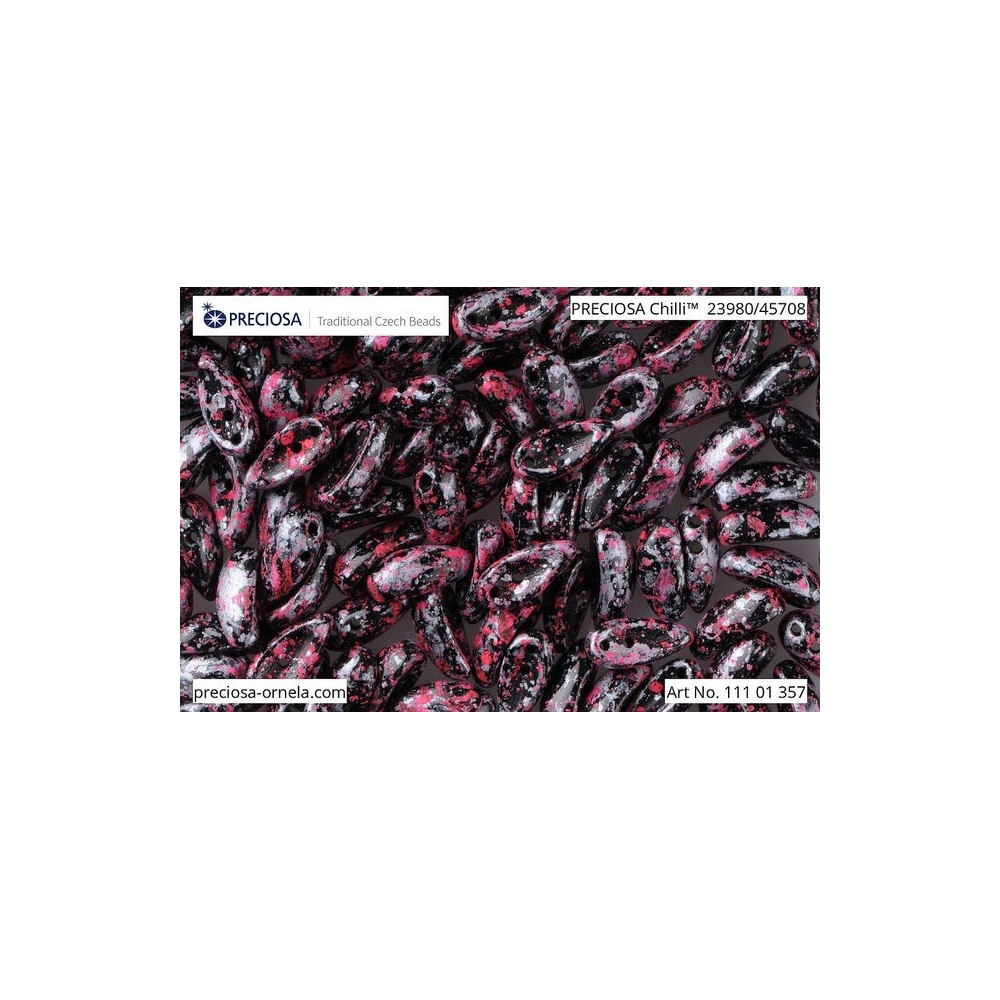 Růžové a šedé střípky tančící na hlubokém černém podkladu připomínají texturu vzácné žuly a vnášejí do každého šperku prvek syrové elegance. Tyto mačkané dvoudírkové korálky Preciosa Chilli o rozměru 4 x 11 mm svým prohnutým tvarem připomínají lusk chilli papričky, což designérům otevírá nevídané možnosti při tvorbě prostorových objektů. Díky dvěma paralelním dírkám o průměru 0,85 mm korálky v návleku perfektně lícují a umožňují vytvářet bohaté textury, které vyniknou zejména v kombinaci s typem Preciosa Farfalle, jak ve svých elegantních náramcích demonstruje Hana Černá.