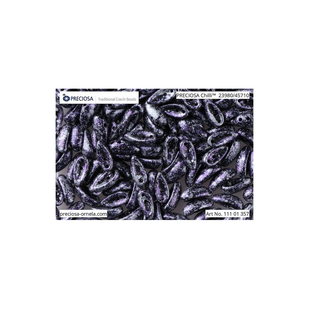 Materiál sklo v této úpravě působí velmi luxusně a nejlépe vynikne v kombinaci s kovovými doplňky v barvě starostříbra nebo antracitu. Pro dosažení harmonického designu zkombinujte korálky s odstíny burgundy nebo vínové, zatímco pro odvážný kontrast můžete zvolit sytě zelené tóny v barvě peridot. Skvělých výsledků dosáhnete také při zapojení korálků Preciosa Thorn, se kterými Chilli tvoří osvědčené duo pro výrobu prostorových náušnic a originálních přívěsků.