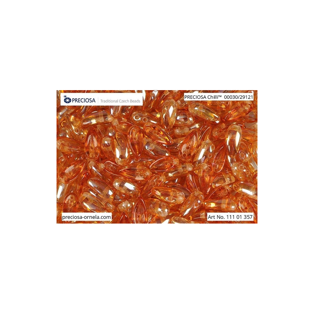 Průhledný základ v odstínu Crystal s jemným nátěrem Apricot Medium vytváří na povrchu korálku fascinující hru světla a stínu. Tyto mačkané korálky jsou díky své konstrukci se dvěma otvory o průměru 0,85 mm nesmírně univerzální a umožňují složité prostorové modelování. Pro precizní výsledky a stabilitu vašich designů je ideální použít rokajl Preciosa, který poslouží jako funkční spojovací a výplňový materiál mezi jednotlivými segmenty Chilli.