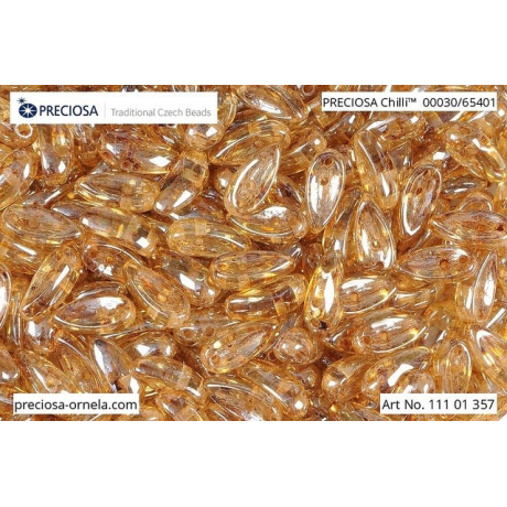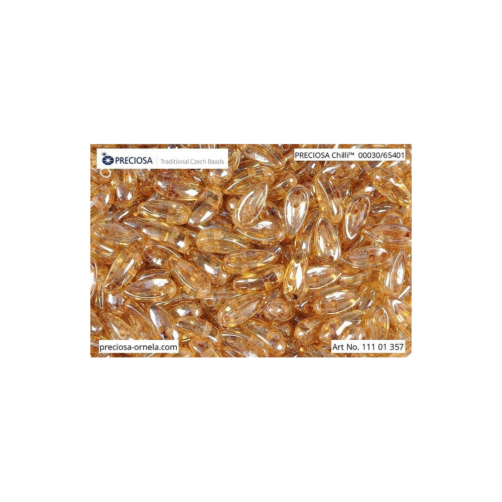 Rozměr 4 x 11 mm a dva otvory o průměru 0,85 mm charakterizují tyto mačkané korálky Preciosa Chilli v provedení Picasso Honey. Specifický prohnutý tvar umožňuje vytvářet komplexní vzory a textury, které vyniknou zejména v kombinaci s prvky jako jsou české broušené ohňovky při tvorbě elegantních rozet. Jejich organický design připomínající okvětní lístky dodává hotovým šperkům unikátní hloubku a zajímavou plasticitu, která je pro moderní bižuterii velmi žádaná.