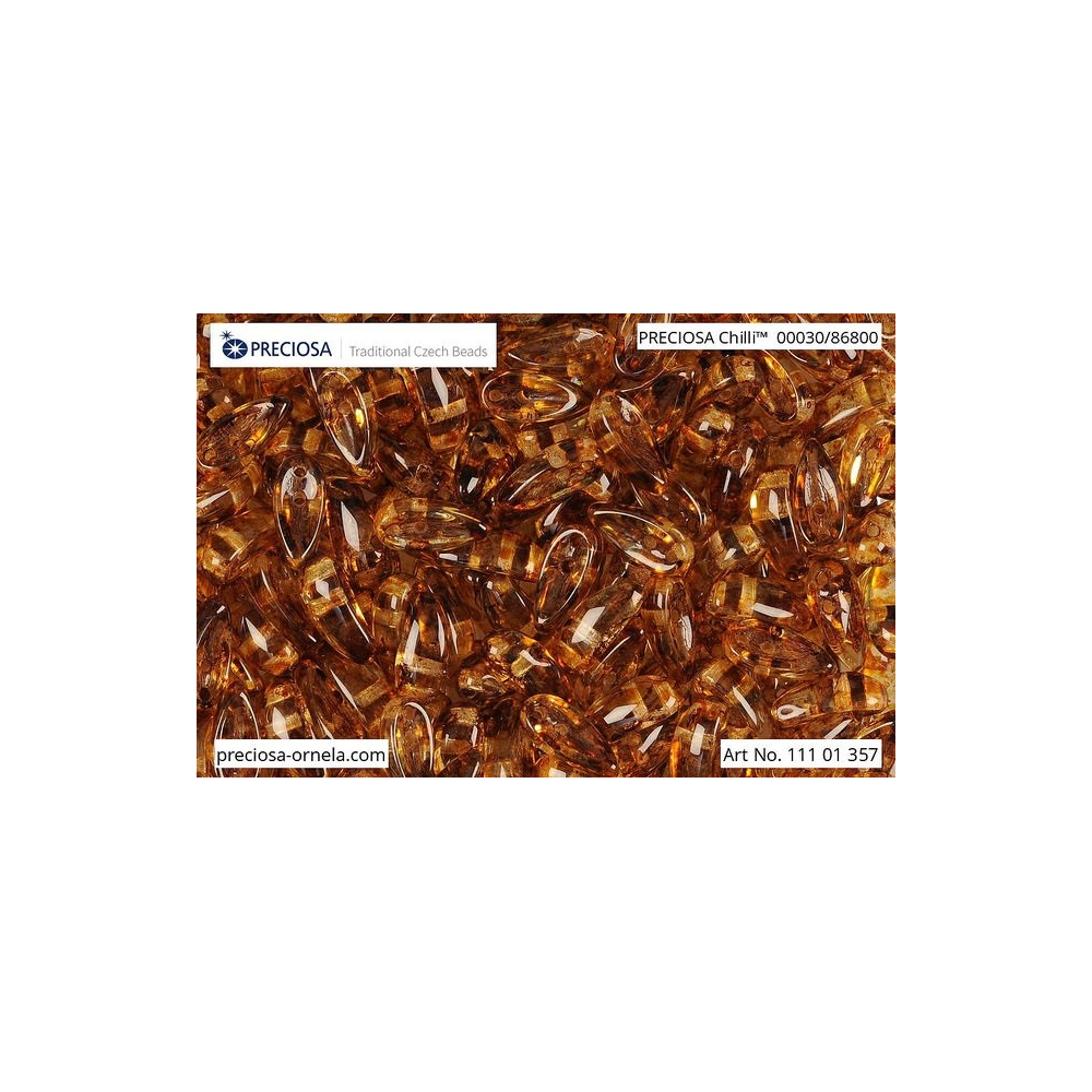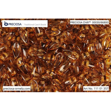 Hnědá barva v kombinaci s efektem travertinu přináší do tvorby šperků organický nádech, který skvěle doplňuje současné přírodní trendy. Mačkané korálky Preciosa Chilli ve velikosti 4 x 11 mm vynikají svým prohnutým tvarem připomínajícím chilli papričku, což z nich dělá ideální materiál pro prostorové vyšívání i moderní strukturované designy. Jejich specifická ergonomie dovoluje hladké zapadnutí do sebe a vytváření zajímavých textur v náročnějších projektech. Pro dosažení nejlepších výsledků u takto tvarovaných prvků doporučujeme použít nit S-lon FIRE, se kterou je ideální korálkovací jehla velikosti 10-11, aby se zajistil bezpečný vícenásobný průchod nití korálkem o průměru 0,85 mm.
