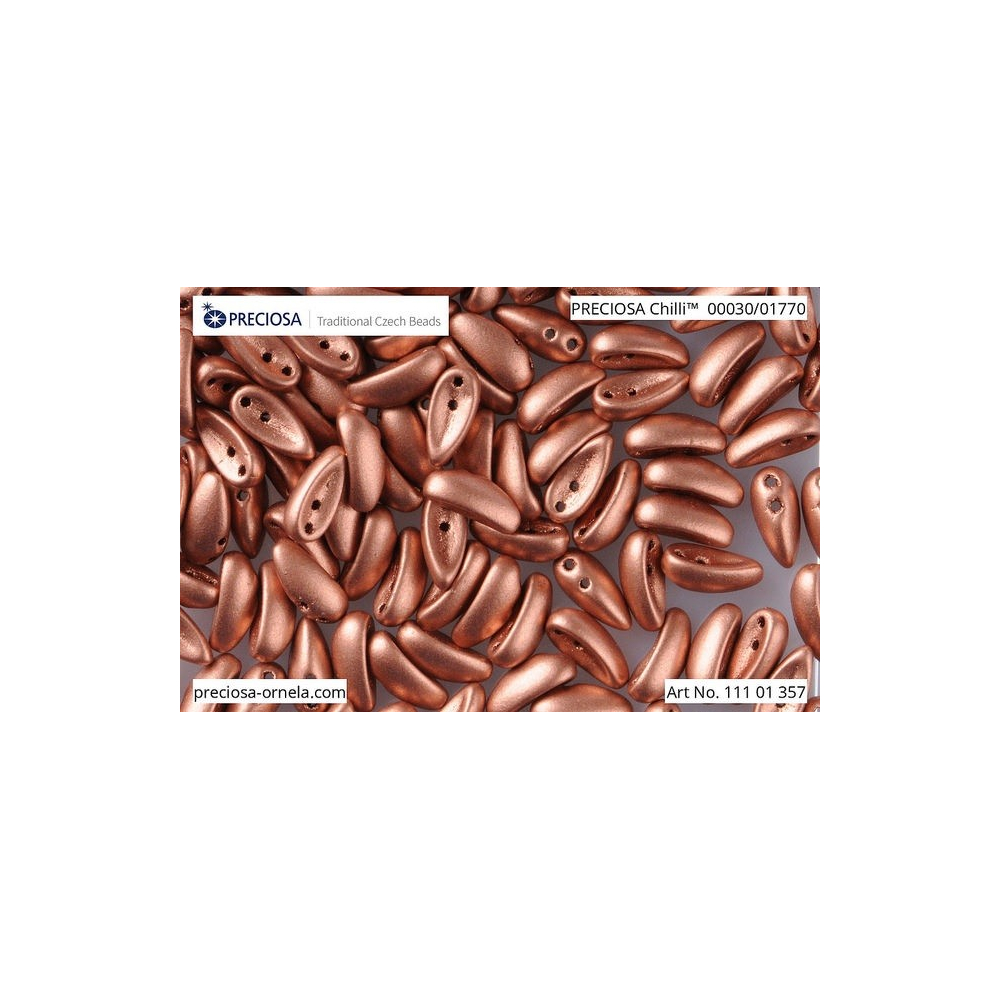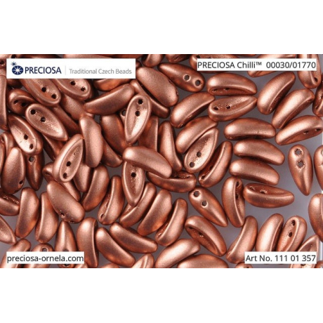 Bronzové odlesky a elegantní zakřivení korálků Chilli vnesou do vašich autorských šperků nádech luxusu a hloubky. Tyto mačkané dvoudírkové korálky z dílny Preciosa, která navazuje na více než 300letou sklářskou tradici, vynikají svým unikátním tvarem a širokou barevnou paletou. Při šití náročných projektů je skvěle doplní Matubo SuperDuo, se kterým tvoří harmonické květinové motivy a geometrické struktury. České skleněné korálky v barvě Copper Bronze o velikosti 4 x 11 mm jsou ideální pro každého, kdo hledá originální komponenty s českým řemeslným rukopisem.