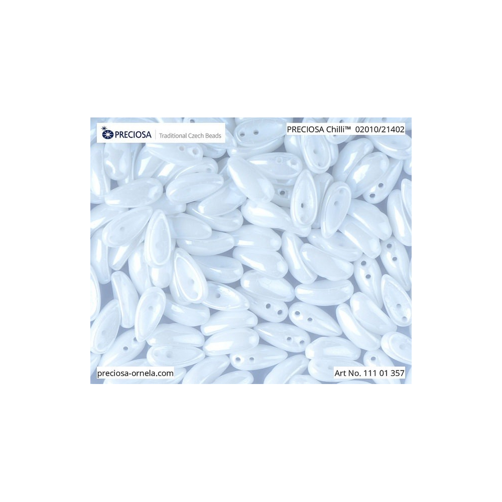 Mačkané dvoudírkové korálky Preciosa Chilli o rozměru 4 x 11 mm se vyznačují specifickým prohnutým tvarem, který do sebe při skládání zajímavě zapadá. Díky dvěma dírkám o průměru 0,85 mm nabízejí nekonečné možnosti v prostorovém šití a tvorbě složitých geometrických vzorů. Zvláštní povrchová úprava Gold Shine na bílém podkladu vytváří hravé odlesky, které mění intenzitu podle dopadu světla.