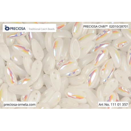 Bílá alabastrová barva s jemnými duhovými odlesky vyřeší vaše dilema, jak dodat šperku luxusní vzhled, aniž byste narušili jeho barevnou harmonii. Tyto dvoudírkové korálky Chilli od tradičního výrobce Preciosa o velikosti 4 x 11 mm jsou díky svému prohnutému tvaru ideální pro vytváření bohatých 3D struktur a náročných vzorů. Skvěle doplňují oblíbené Matubo SuperDuo při tvorbě květinových motivů nebo mandal, kde jejich tvar připomínající okvětní lístky dodává designu přirozenou dynamiku. Tato česká tradice v mačkaném skle vyniká výjimečnou barevnou škálou, která z každého vašeho projektu udělá originální umělecké dílo.