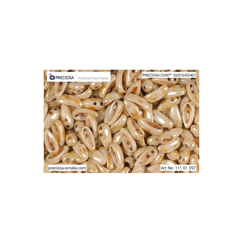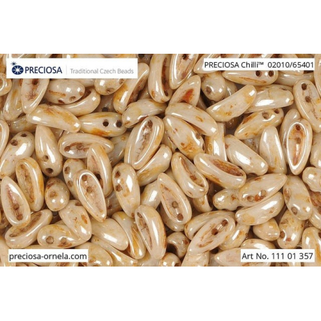 Křišťálové údolí na severu Čech je po staletí domovem sklářského umění, ze kterého pocházejí i tyto unikátní korálky Preciosa Chilli. Jejich prohnutý tvar připomínající lusk v rozměru 4 x 11 mm v sobě nese eleganci tradičního mačkaného skla, kterému dominuje jemný krémový základ s medovým Picasso finišem pod kódem 02010/65401. Tento specifický design se skvěle doplňuje s tvary jako Preciosa Pip, se kterými tvoří harmonické organické vzory. V barevných kompozicích korálky krásně ladí s opálovými či mléčnými tóny, ale pokud hledáte výrazný kontrast, zkombinujte je se safírově modrou barvou.