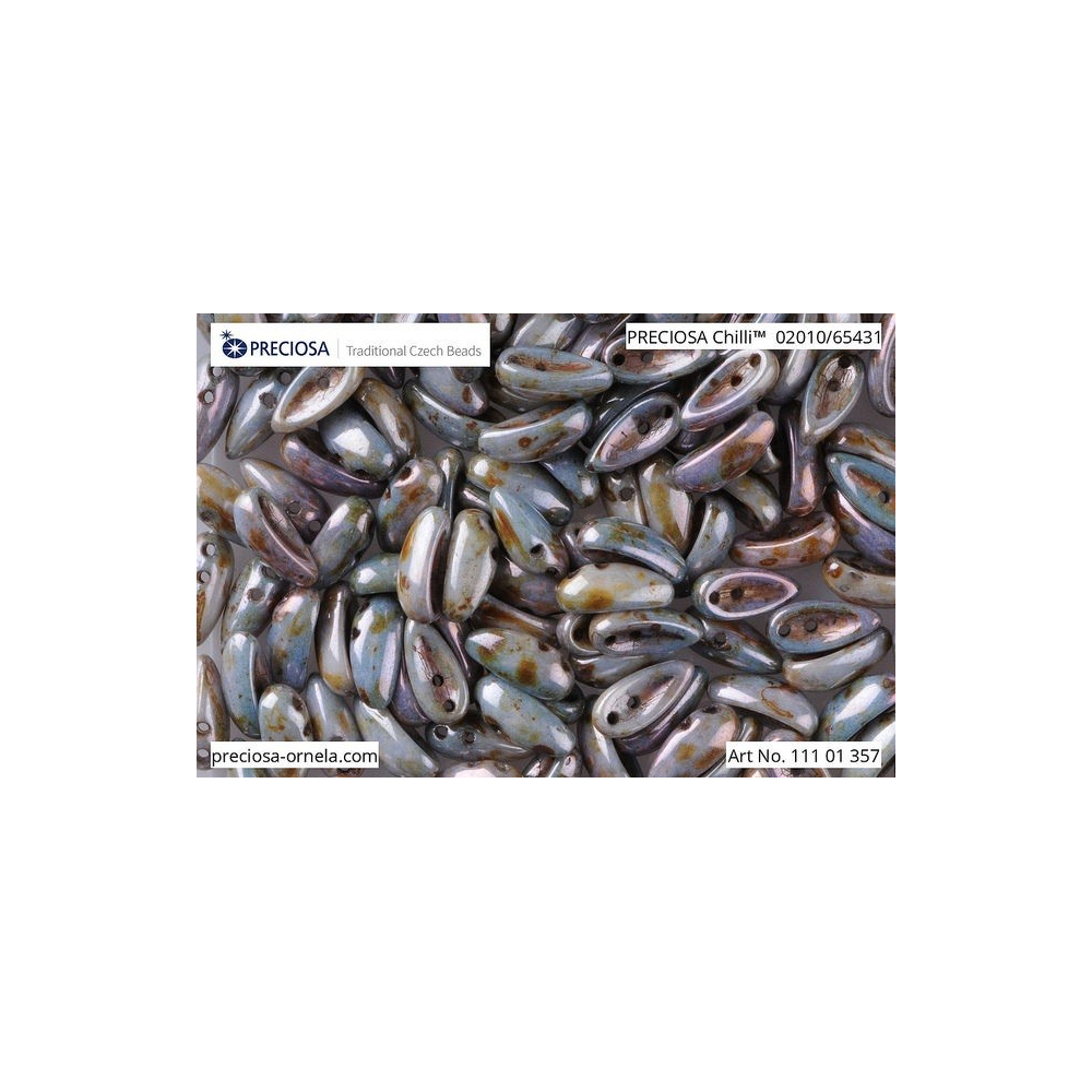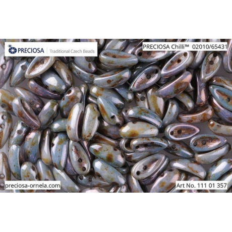 Modrošedý základ s hnědými skvrnkami v úpravě Picasso krásně ladí s opálovými či mléčnými tóny pro jemnější vzhled, nebo vsaďte na odvážný kontrast s černým jetem. Tvarované korálky Chilli vyžadují pevnou nit, proto je pro nejlepší výsledky doporučena nit S-lon FIRE, kterou použijte s korálkovací jehlou velikosti 10-11 pro hladký průchod oběma otvory. Jako výplňový materiál k tomuto tvaru skvěle poslouží drobný rokajl Preciosa, který zajistí plynulé přechody v propracovaných šitých náhrdelnících či náramcích.