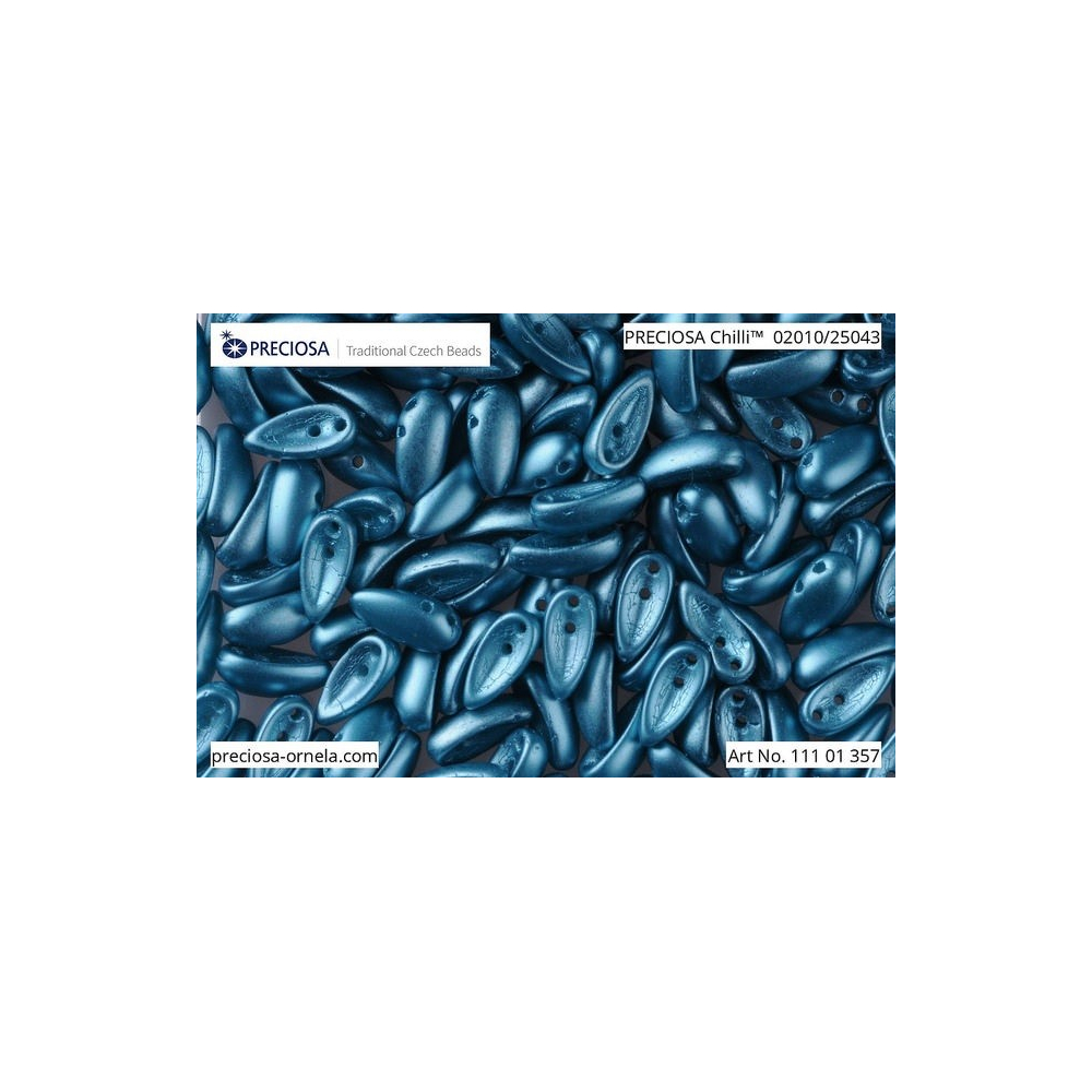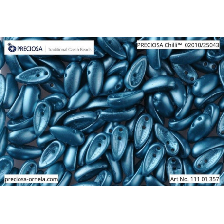 Modrozelená barva v odstínu Teal Blue vnáší do bižuterní tvorby nádech luxusu a hloubky oceánu. Tyto dvoudírkové korálky Chilli Preciosa o rozměru 4 x 11 mm vynikají svým prohnutým tvarem, který umožňuje vytvářet organické struktury i moderní geometrické vzory. Pro dosažení esteticky vyvážených kompozic je designéři často kombinují s tvary Preciosa Pip, se kterými do sebe jednotlivé prvky v květinových motivech harmonicky zapadají.