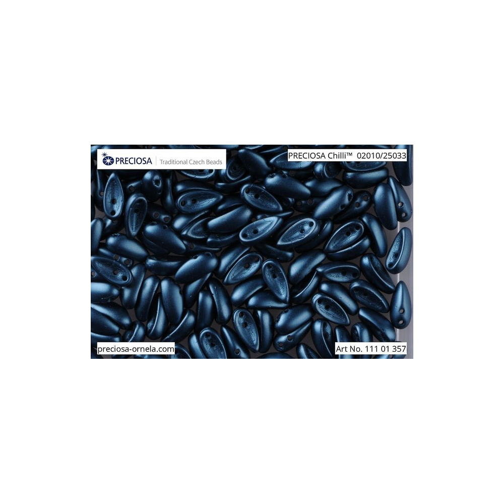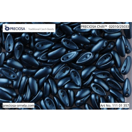 Mačkané dvoudírkové korálky Chilli v podmanivém odstínu modrozelená s perleťovým finišem představují moderní pojetí tradičního řemesla. Svým tvarem připomínajícím chilli papričku o rozměru 4 x 11 mm nabízejí designérům nekonečné možnosti při vytváření prostorových objektů a šitých šperků. Pro technicky náročnější projekty doporučujeme použít pevné nitě S-lon FIRE, které zajistí stabilitu šitého šperku.