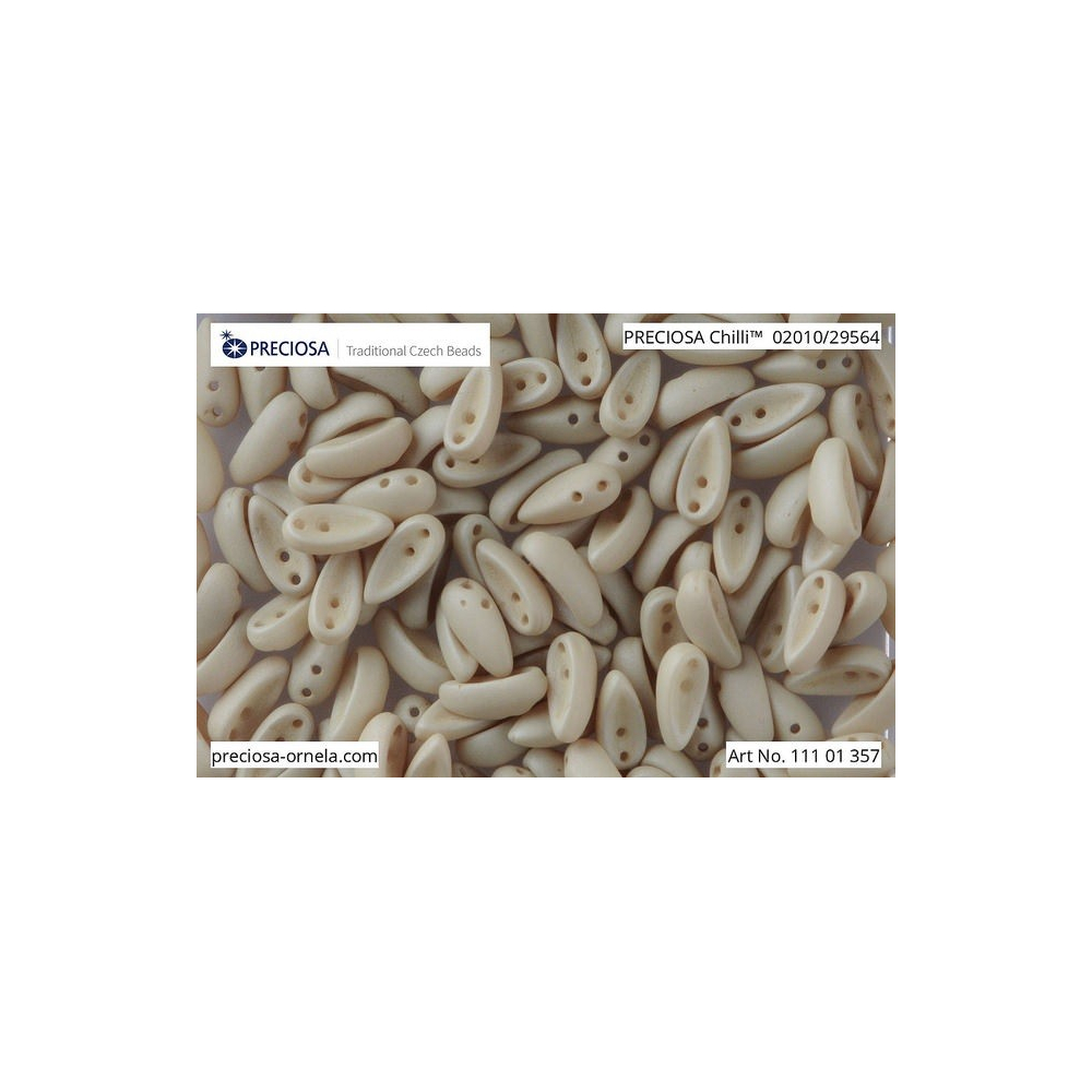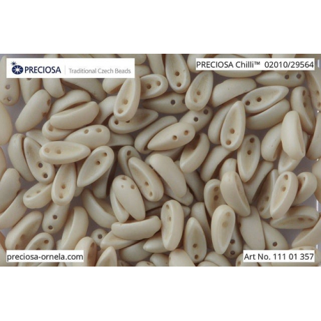 Rozměr 4 x 11 mm a precizně umístěné dvě dírky o průměru 0,85 mm definují mačkané korálky Preciosa Chilli v sofistikovaném matném provedení s kódem barvy 02010/29564. Tento specifický, mírně prohnutý tvar umožňuje designérům efektní vrstvení a vytváření bohatých prostorových textur, přičemž béžová barva s jemným olivovým nádechem dodává šperku naturální vzhled. Při tvorbě složitějších vzorů se tyto korálky často kombinují s prvky jako Matubo SuperDuo, se kterými lze snadno docílit harmonických květinových a hvězdicových motivů.