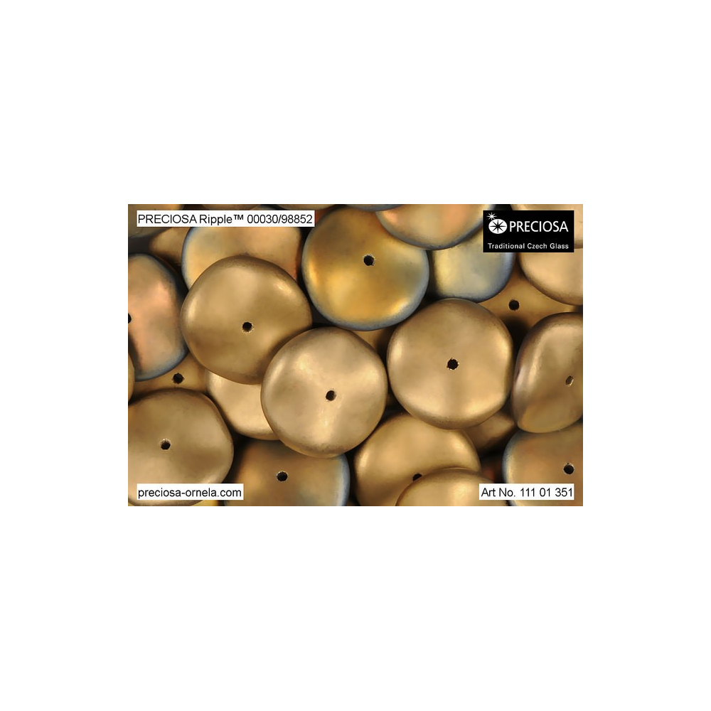 Zlatá barva s efektem California Sunshine a jemným matným povrchem definuje tento specifický tvar mačkané perle. Rozměr 12x4 mm a středový otvor dělají z těchto korálků Preciosa Ripple™ ideální prvek pro vytváření 3D struktur a zajímavých povrchových textur ve vašich designech. Jejich zvlněný povrch vytváří při dopadu světla fascinující hru odlesků a stínů.