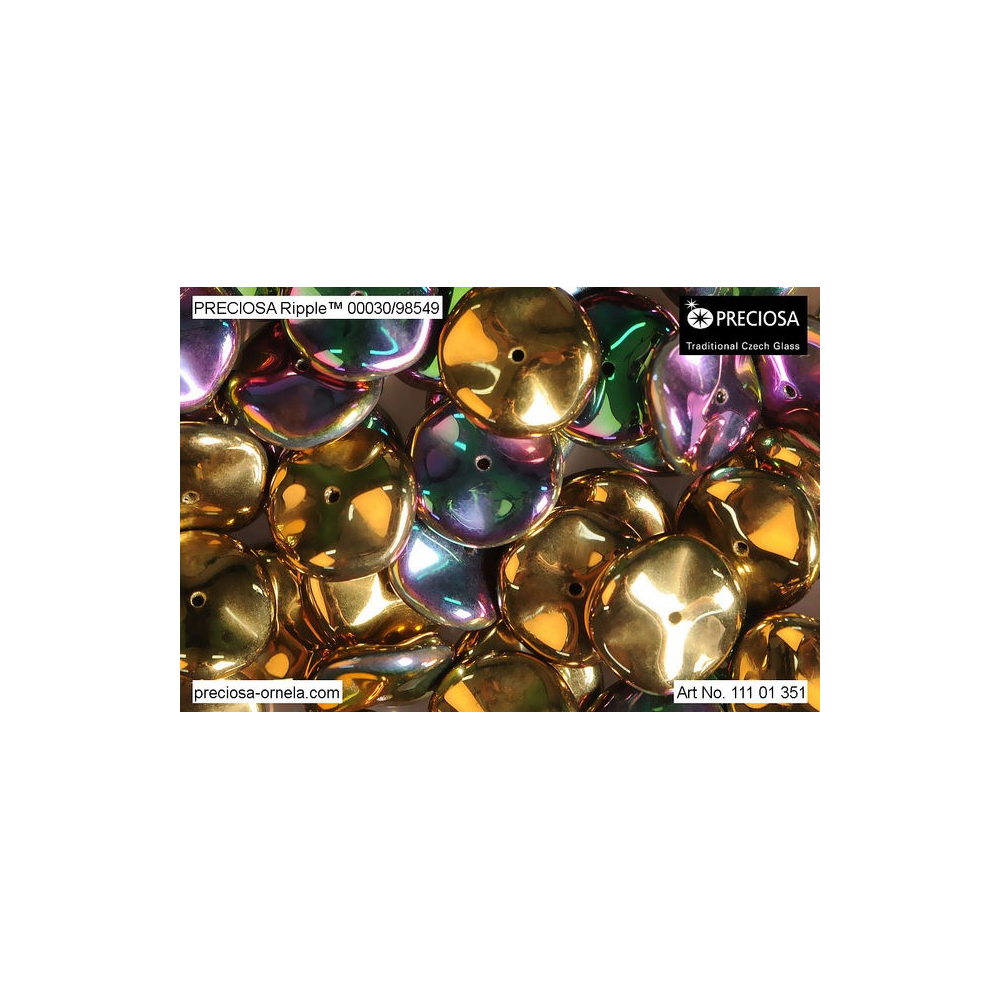 Preciosa Ripple s rozměrem 12x4 mm představuje fascinující ukázku mačkané perle, jejíž vlnitý povrch vytváří dynamické odlesky světla. Středový otvor o průměru 0,9 mm je ideální pro provlékání nitě a umožňuje vytvářet složité prostorové kompozice. Tento skleněný korálek se stal vyhledávaným prvkem díky svému unikátnímu kruhovému tvaru se zvlněným profilem a centrálnímu dírce.