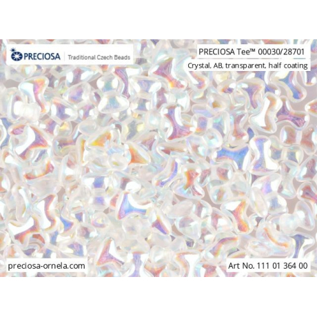 Křišťálové sklo s polovičním duhovým pokovem tvoří základ unikátního tvaru korálků Preciosa Tee™ o rozměru 2x8 mm. Tento specifický design připomínající písmeno T disponuje středovým průtahem o velikosti 0,8 mm, který je navržen pro hladký vícenásobný průchod nití korálkem. Díky své unikátní konstrukci umožňují korálky těsné sesazování do řad, čímž vytvářejí zajímavé plastické struktury připomínající zip nebo rybí šupiny. Balení obsahuje přibližně 30 kusů těchto vysoce kvalitních prvků, které jsou nepostradatelné pro náročné projekty vyžadující zajímavou geometrii.