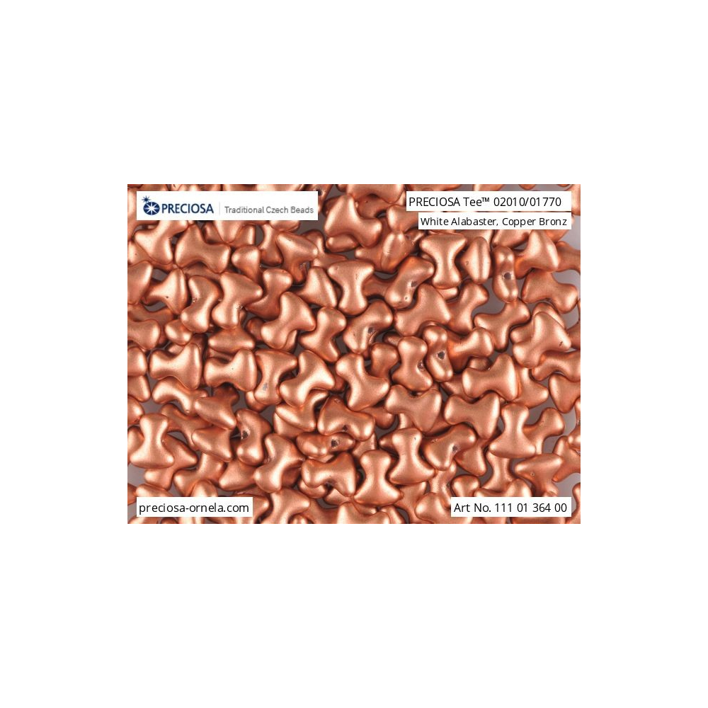 Měděná barva s bronzovými odlesky a jemným saténovým povrchem dodává těmto korálkům o rozměru 2x8 mm nezaměnitelný charakter. Svým unikátním tvarem připomínajícím písmeno T nabízejí designérům zcela nové možnosti prostorového skládání, kde se jednotlivé dílky do sebe zaklesnou a vytvoří fascinující textury. Skvěle se doplňují s klasickým kulatým materiálem, jako je například rokajl Preciosa 6/0, čímž vznikají plastické vzory s vysokou estetickou hodnotou.