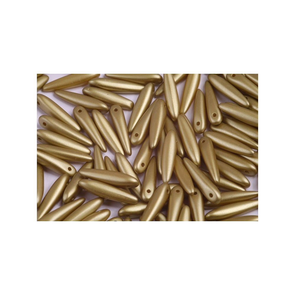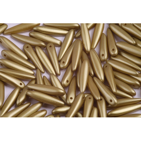 5x16 mm měřící skleněné ostny z tradiční české produkce Preciosa představují ideální volbu pro designéry hledající dynamiku a hloubku ve svých špercích. Zlatá barva s označením 02010/25021 vyniká jemným saténovým odleskem, který dodává mačkaným korálkům luxusní vzhled. Otvor o průměru 0,8 mm je umístěn v širší části korálku, což umožňuje volný pohyb a vytváření efektních třásní či bohatých strukturálních povrchů. Díky svému štíhlému tvaru se skvěle doplňují s Matubo SuperDuo, kde vytvářejí zajímavou strukturu s Thorn okraji.