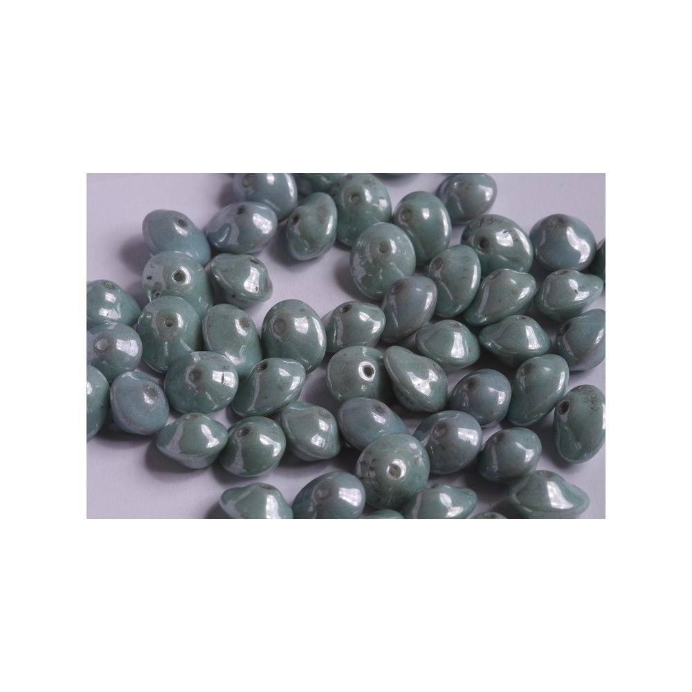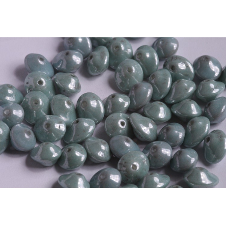 Materiálem pro tyto skvosty je prvotřídní české sklo v jemném odstínu White Alabaster s povrchovou úpravou Green Luster. Tato specifická kombinace dodává korálkům podmanivý lesk a hloubku, která vynikne zejména při pohybu hotového šperku na přirozeném světle. Díky velikosti 7x11 mm se stávají dominantním prvkem náhrdelníků i decentním doplňkem náušnic, přičemž se krásně kombinují s rokajlem Preciosa 8/0 pro dosažení zajímavých textur.