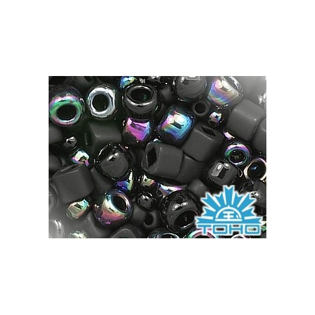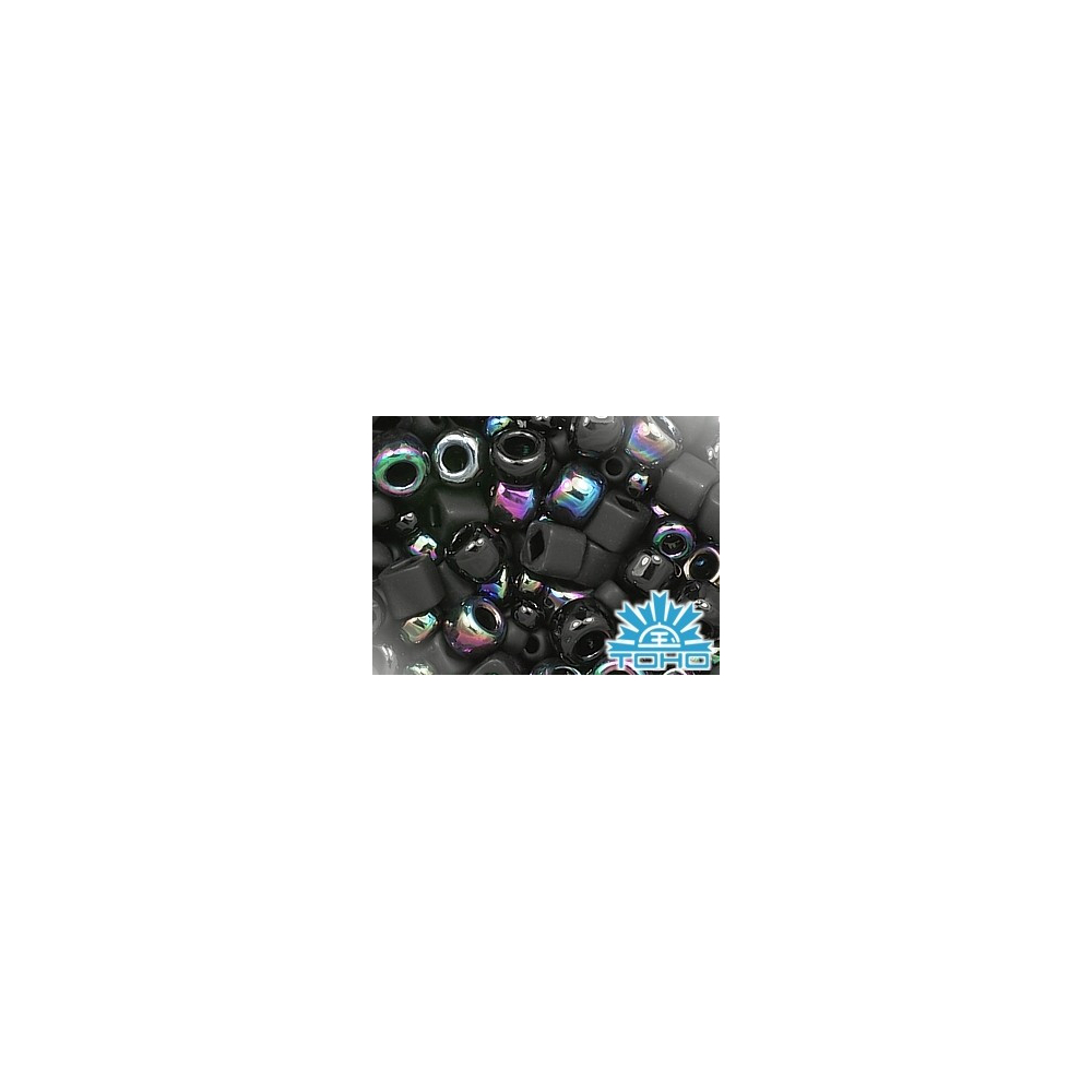 Směs TOHO Mix chytře kombinuje různé tvary a povrchy, včetně typů TOHO Round a TOHO Cube, čímž vytváří zajímavou texturu ve vašem designu. Kombinace matných, lesklých a duhových prvků v barvě Borakku- Black Mix zajišťuje, že váš šperk nebude působit plochým dojmem. Různé tvary korálků v jedné směsi umožňují vytvářet originální geometrické vzory s minimálním úsilím.